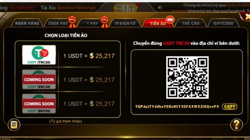 Hit Club gần đây đã tích hợp hình thức nạp bằng tiền ảo với đồng USDT. Tỷ giá nạp hiện tại là 1 USDT = 24.052 VNĐ. Người chơi có thể thực hiện chuyển tiền nhanh chóng bằng cách quét mã QR hoặc chuyển tiền trực tiếp thông qua địa chỉ ví mà Hit Club cung cấp. Đây là một bước tiến mới trong việc áp dụng công nghệ tài chính hiện đại, tạo thêm sự tiện lợi cho những người chơi yêu thích sử dụng tiền điện tử.