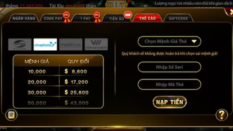 Nạp tiền bằng thẻ cào là phương thức bảo mật cao và được nhiều người chơi lựa chọn. Hit Club hỗ trợ nạp qua 4 nhà mạng chính tại Việt Nam là Viettel, Vinaphone, Mobifone và Vietnamobile. Người chơi chỉ cần điền thông tin mệnh giá, số series và mã thẻ là tiền sẽ được cộng vào tài khoản ngay lập tức. Phí chiết khấu hiện tại ở Viettel là 18%, còn các nhà mạng khác là 20%.